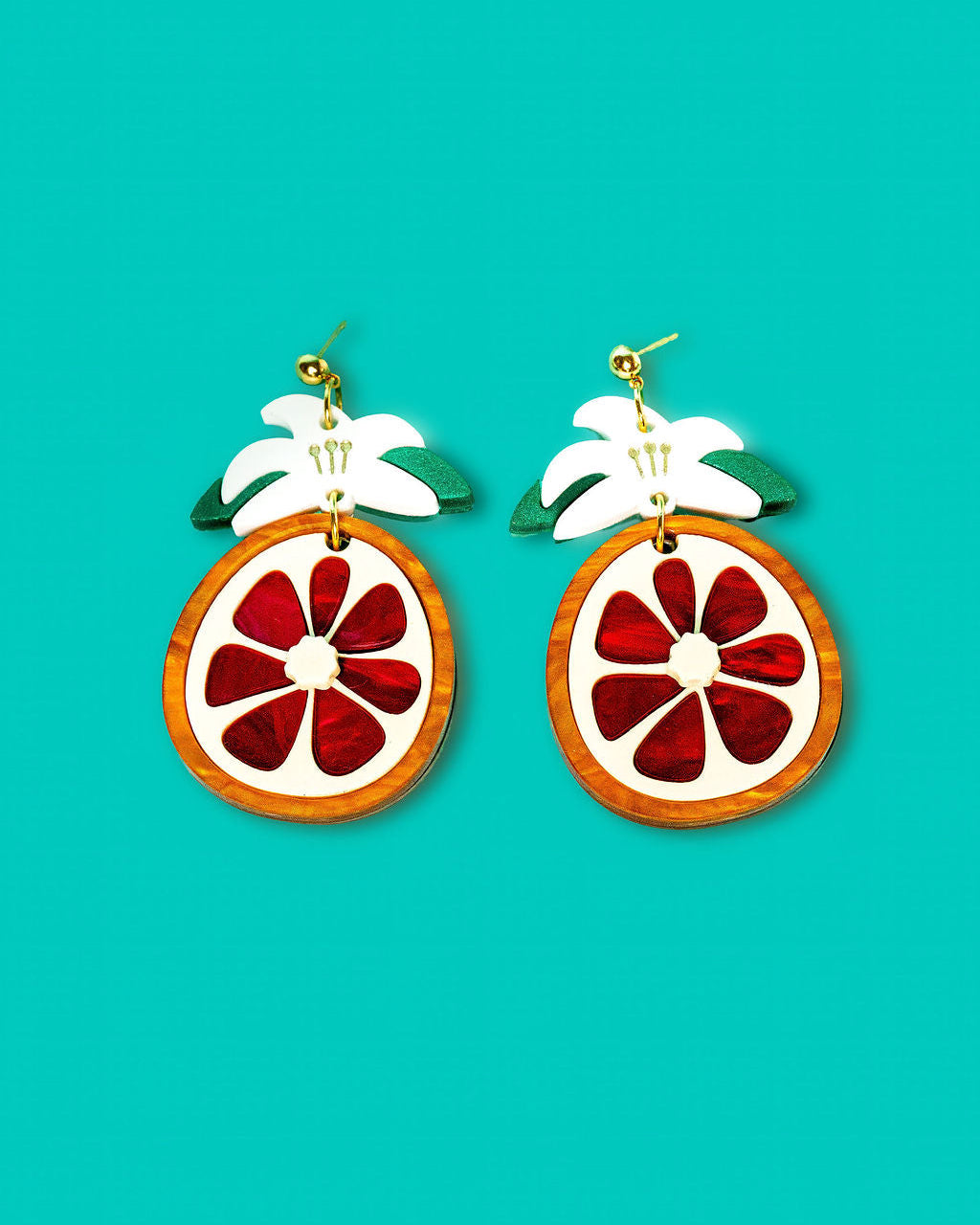 The Red Grapefruit are laser cut on acrylic for lightweight, comfortable wear, then assembled with gold plated, hypoallergenic and nickel-free hardware. Each pair is designed and handmade in Houston, Texas.